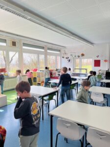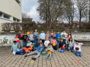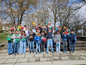 Vor den Osterferien fand die Osternestsuche statt. Jedes Kind hatte im Kunstunterricht ein tolles Nest gestaltet, das befüllt versteckt war. Als alle Kinder ihr Nest gefunden hatten, machten wir noch ein gemeinsames Bild auf dem Schulhof.